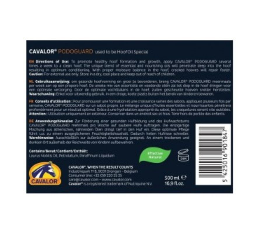 Cavalor PodoGuard 將滋養油與獨特的精油結合。 蹄油的活性成分透過滲入的方式進入馬蹄,提供水分平衡、營養,以提高馬蹄的品質與日常護理。油性特質,同時具有對外抑制細菌侵入馬蹄的作用。本蹄油非藥品,無藥用作用。使用方法:每日建議1-2次,可每日擦拭於馬蹄表面與底部。 規格 500ml
