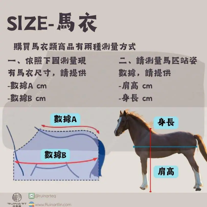 依照圖片左邊所示,測量您現有馬衣的「數據 A」與「數據 B」。