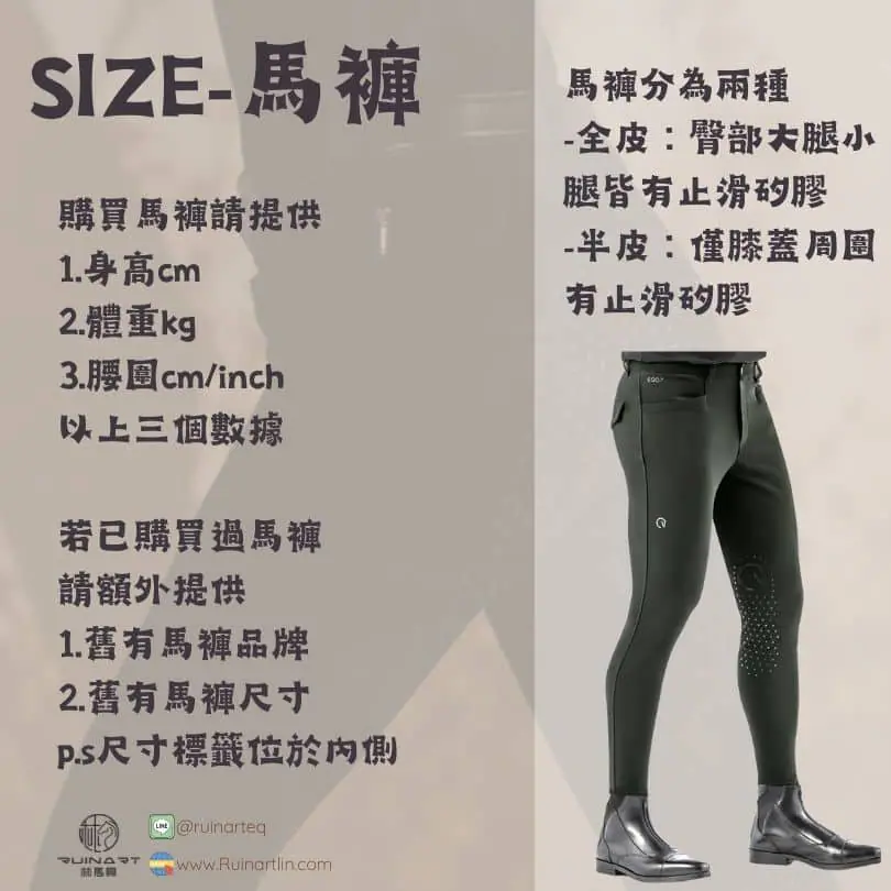 馬術專用馬褲共分為「全皮」和「半皮」兩種。全皮馬褲在臀部大腿、小腿處皆有止滑矽膠;半皮馬褲僅膝蓋周圍有止滑矽膠。