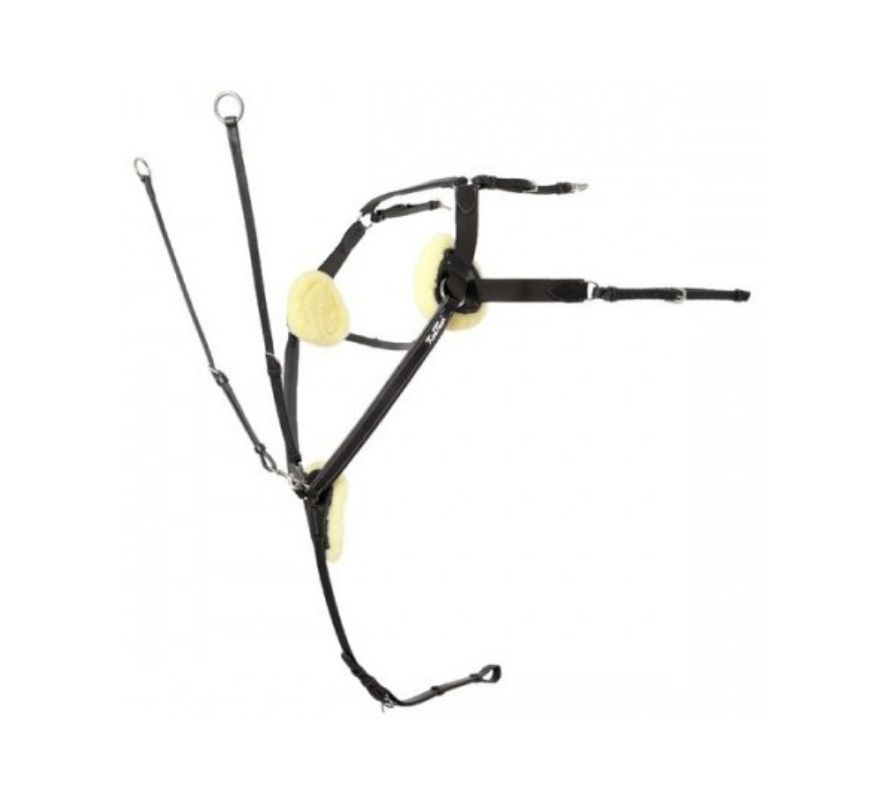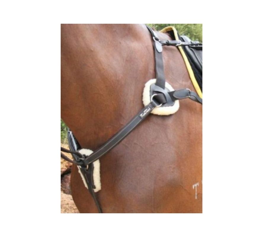 Kentaur胸革帶Palermo採用三點式固定,並於固定位置加上羊毛襯墊。此配件用於避免馬頭抬起過高,同時保有一定的空間得以伸展。尺寸皆可以微調。黑色皮革搭配白色縫線。 規格 預購款黑色FULL, 預購款棕色FULL