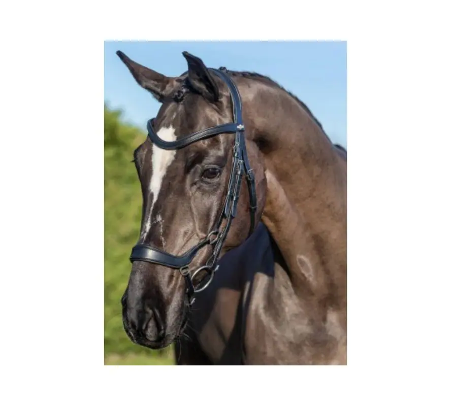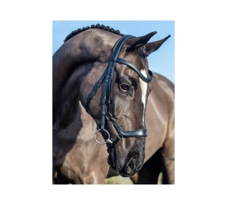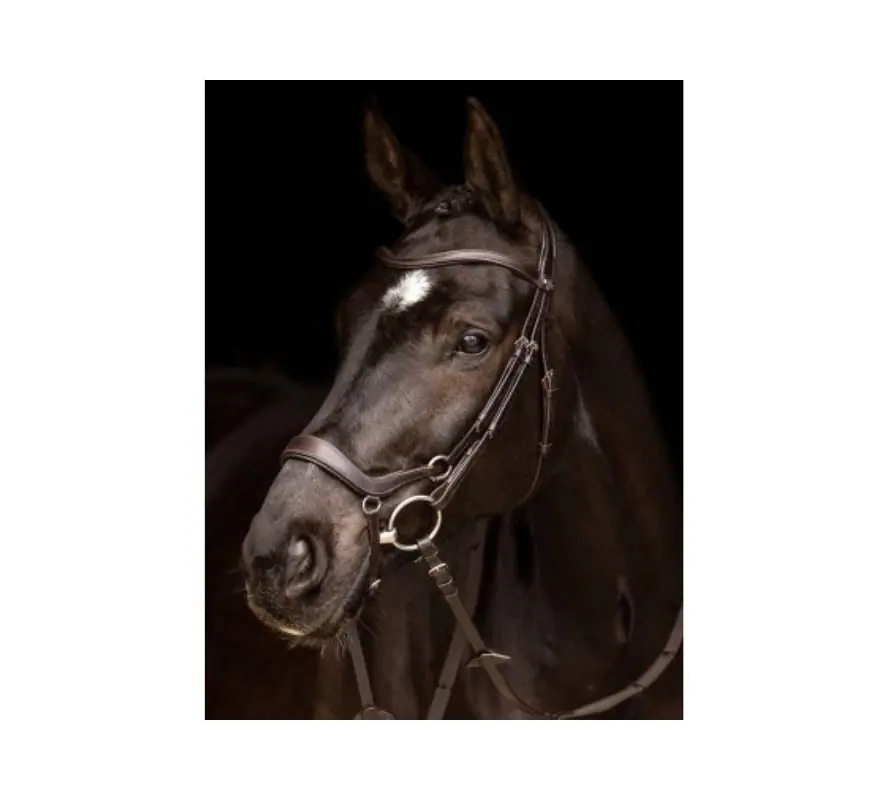 Lemieux 韁繩Drop由柔軟的皮革製成,並符合解剖學形狀設計。韁繩有一個35mm寬的鼻帶,內襯柔軟,可以減緩韁繩帶給馬匹的壓力。鼻帶的特殊形狀連接臉頰的D型環,為馬匹的顴骨提供了更大的自由度,避開了面部敏感的區域,使馬匹配戴時更舒適愉悅。頭頂的設計可以減緩對馬耳所造成的壓力。黑色皮件搭配銀色係搭扣。額革為素面皮革。