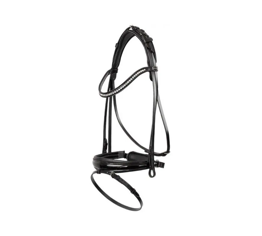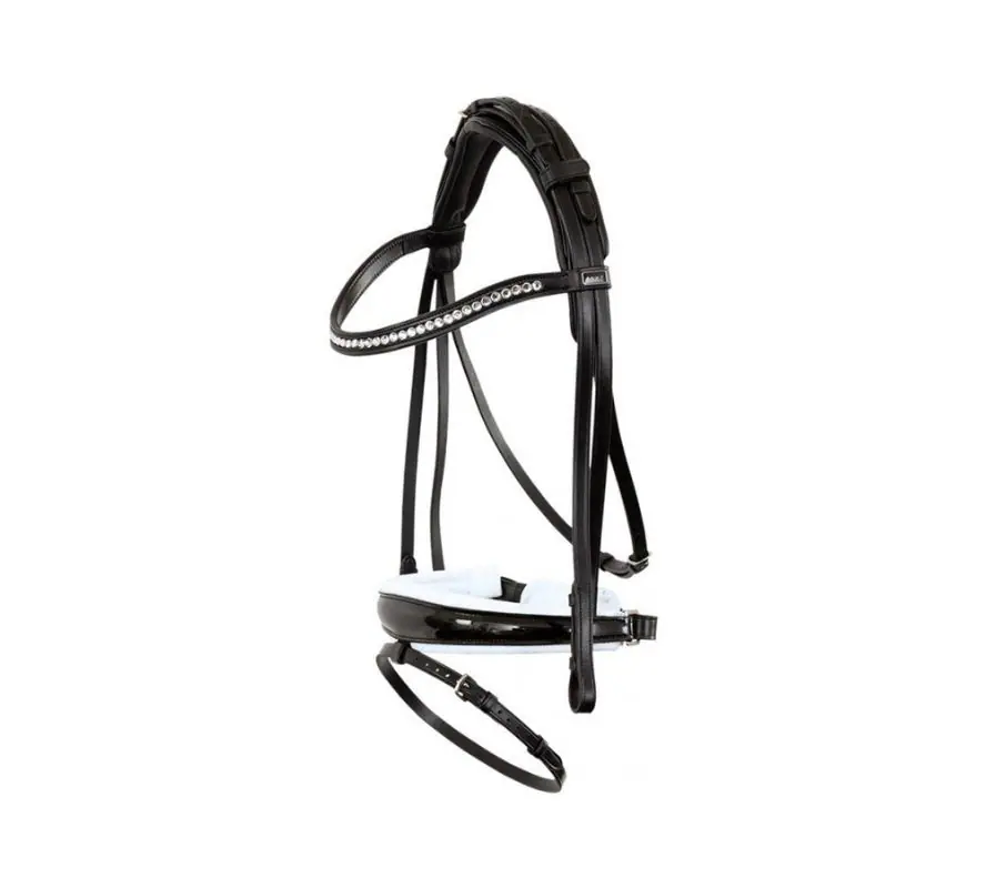 此款 ANKY 韁繩由優質的皮革製成。 配有 50mm 寬的鼻帶,內部襯裡柔軟有彈性,並符合解剖型設計,對馬匹面部來說更加舒適、減壓,外觀為漆皮亮面,可用清水擦拭。頭頂的皮革加寬且配有軟墊,可實現最佳的壓力分佈,並且不會對馬耳造成侷限與壓力。黑色皮革搭配銀色的五金釦件。額革配有水晶裝飾。 顏色 全黑, 黑白 規格 預購款COB, 預購款FULL