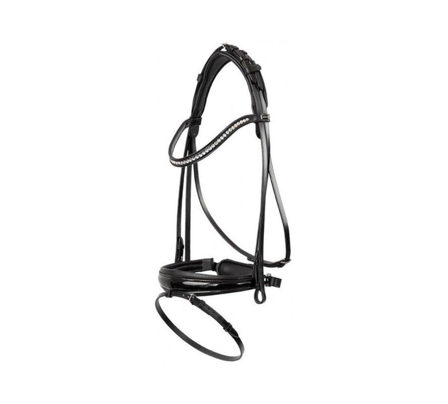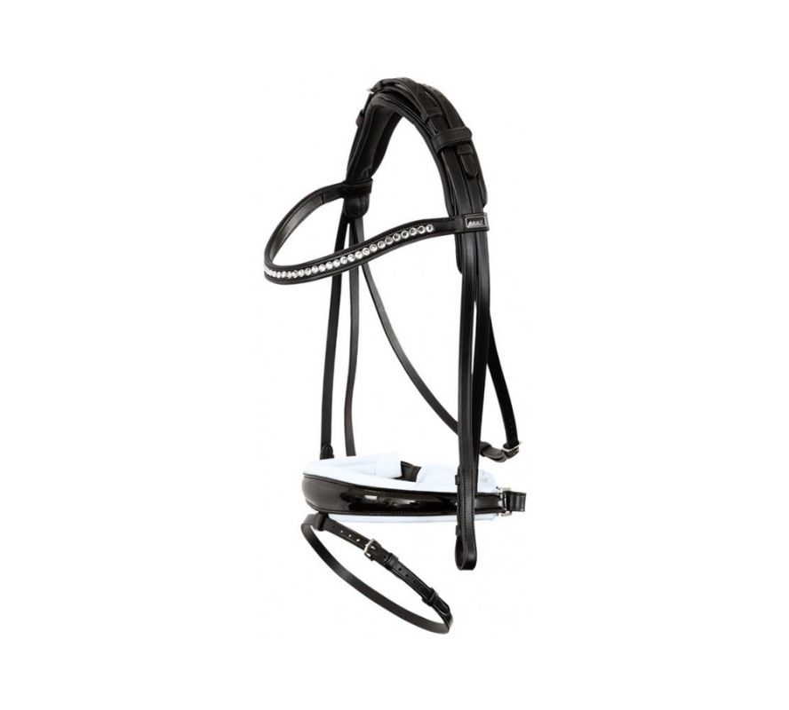 此款 ANKY 韁繩由優質的皮革製成。 配有 50mm 寬的鼻帶,內部襯裡柔軟有彈性,並符合解剖型設計,對馬匹面部來說更加舒適、減壓,外觀為漆皮亮面,可用清水擦拭。頭頂的皮革加寬且配有軟墊,可實現最佳的壓力分佈,並且不會對馬耳造成侷限與壓力。黑色皮革搭配銀色的五金釦件。額革配有水晶裝飾。