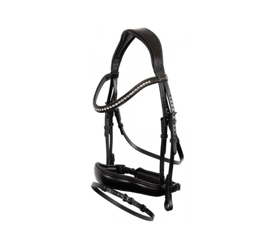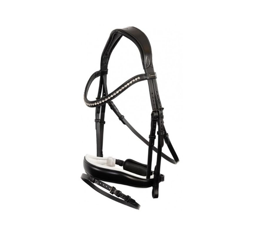 此款ANKY韁繩由優質的皮革製成。 配有45mm寬的鼻帶,內部襯裡柔軟有彈性,並符合解剖型設計,對馬匹面部來說更加舒適、減壓。頭頂的皮革加寬且配有軟墊,可實現最佳的壓力分佈,並且不會對馬耳造成侷限與壓力。黑色皮革搭配銀色的五金釦件。額革配有水晶裝飾。