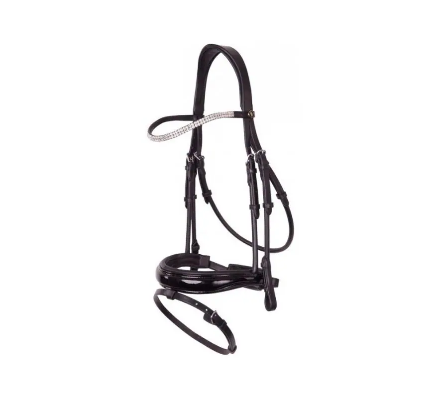 BR 韁繩優質的皮革製成。 配有40mm寬的鼻帶,內部襯裡柔軟有彈性,並符合解剖型設計,對馬匹面部來說更加舒適、減壓,外觀為漆皮亮面,可用清水擦拭。頭頂的皮革加寬且配有軟墊,可實現最佳的壓力分佈,並且不會對馬耳造成侷限與壓力。黑色皮革搭配銀色的五金釦件。額革為雙排的水晶裝飾。