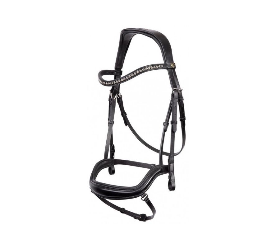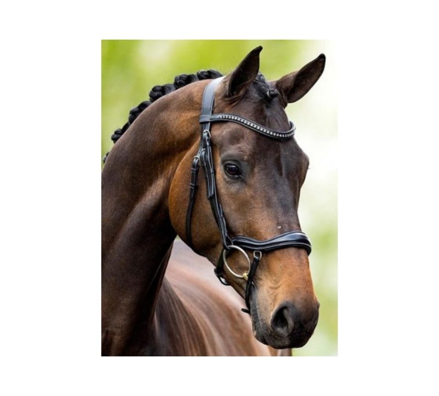 BR 韁繩由優質的皮革製成。 配有40mm寬的鼻帶,內部襯裡柔軟有彈性,並符合解剖型設計,對馬匹面部來說更加舒適、減壓,外觀為漆皮亮面,可用清水擦拭。頭頂的皮革比Plymouth型號更寬且配有軟墊,可實現最佳的壓力分佈,並且不會對馬耳造成侷限與壓力。黑色皮革搭配銀色的五金釦件。額革為雙排的水晶裝飾。 規格 預購款COB, 預購款FULL