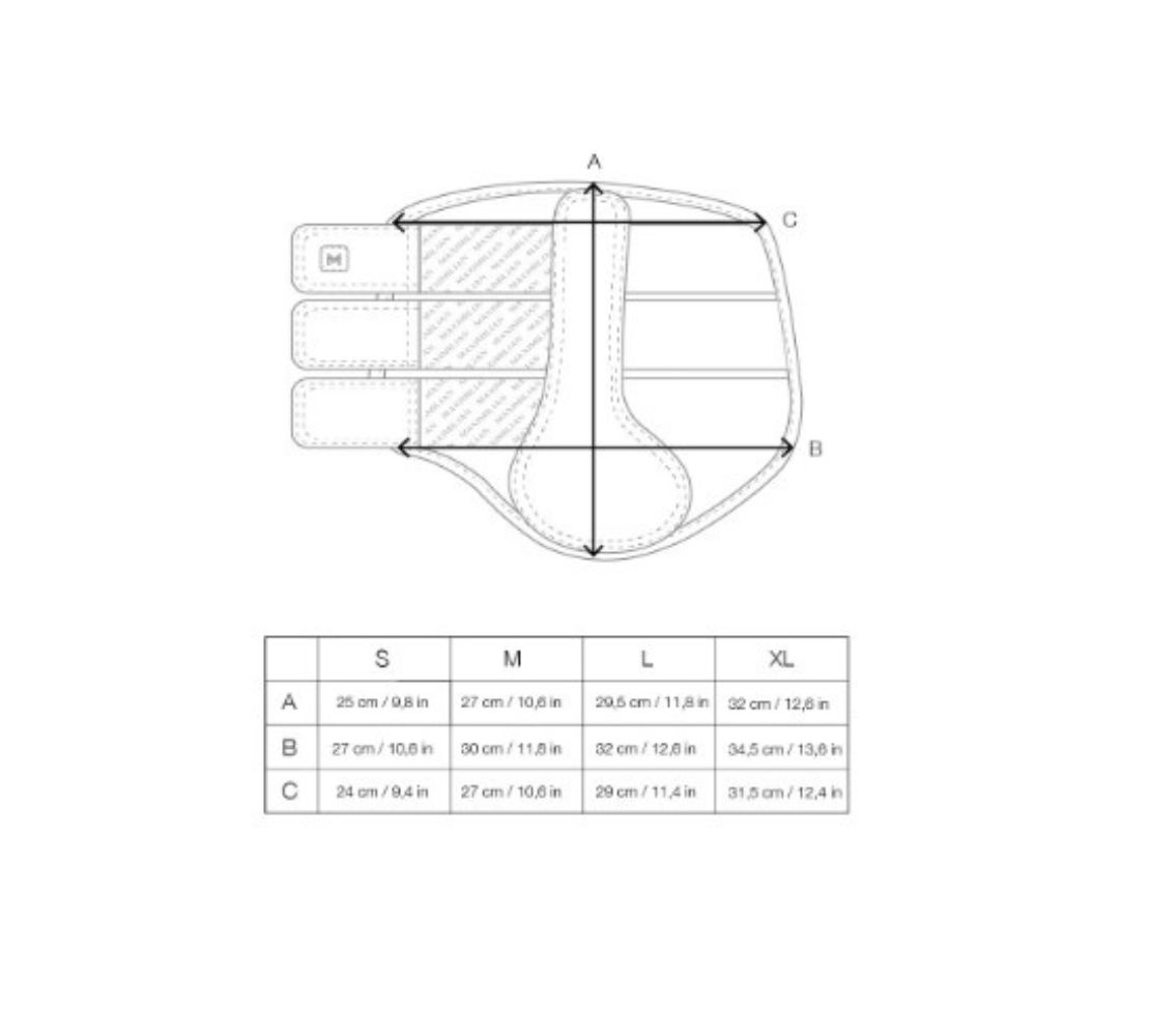 高效防護與透氣結構 輕量化結構設計,於關鍵部位加強吸震,提供卓越衝擊保護 邊緣採用超柔軟優質人造毛皮,提升舒適度並降低熱積聚 穿孔氯丁橡膠內襯,強化通風效果,保持馬腿乾爽 穩定貼合與實用設計 符合馬腿解剖結構的覆蓋範圍,提供穩定且安全的支撐 人體工學支撐設計,確保運動中貼合不位移 耐用魔鬼氈固定系統,穿戴快速便利 適用於前腿與後腿 組合與搭配建議 每組包含兩腿 可與 MaxiMilian Drift 系列 Bell 靴完美搭配,打造完整防護配置 尺寸建議 尺寸標準,建議依照馬匹平時尺寸選購。 規格 M, L, XL