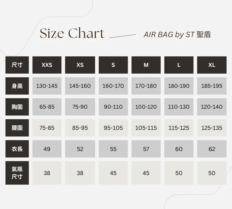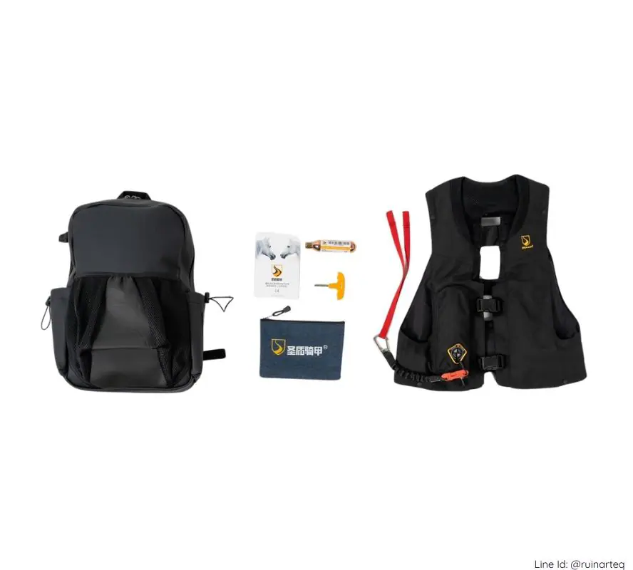 充氣式安全背心,主打輕巧與通風。每件背心附贈一個氣瓶與專用收納包。 大陸製造。 無產品保固。 可保護範圍:身體主要軀幹、頸椎、尾椎。 顏色 黑色 規格 XXS/130cm, XS/145cm, S/160cm, M/170cm, L/180cm, XL/185cm