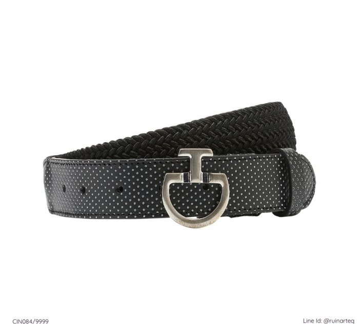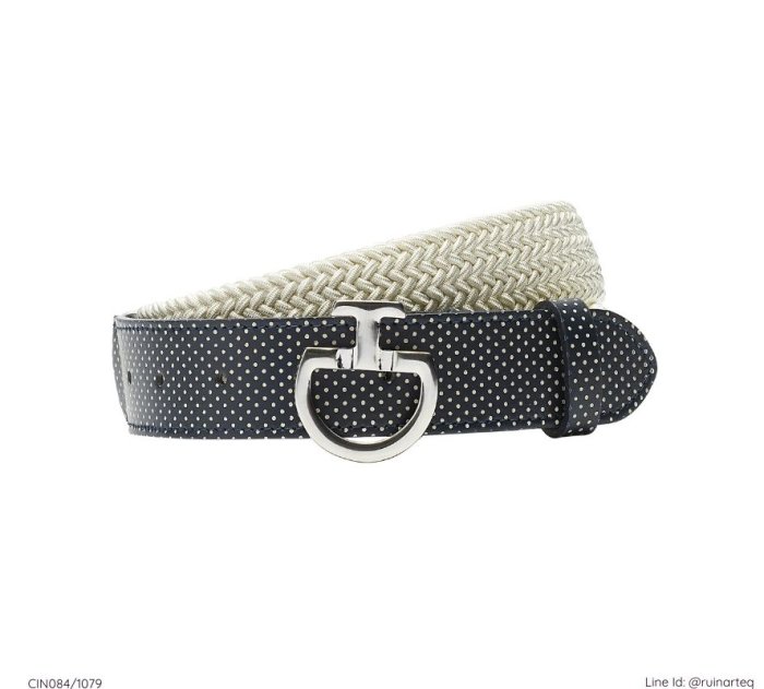 CT品牌女款皮帶,經典款的延伸,屬於限定款,皮帶的編織繩以兩色拼接。彈性的編織皮帶提供最佳的穿著舒適度,皮帶尾端使用皮革精美裝飾,並帶有一個CT標誌的扣環,加以裝飾與固定。