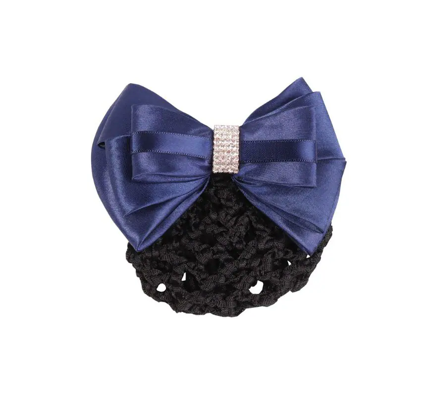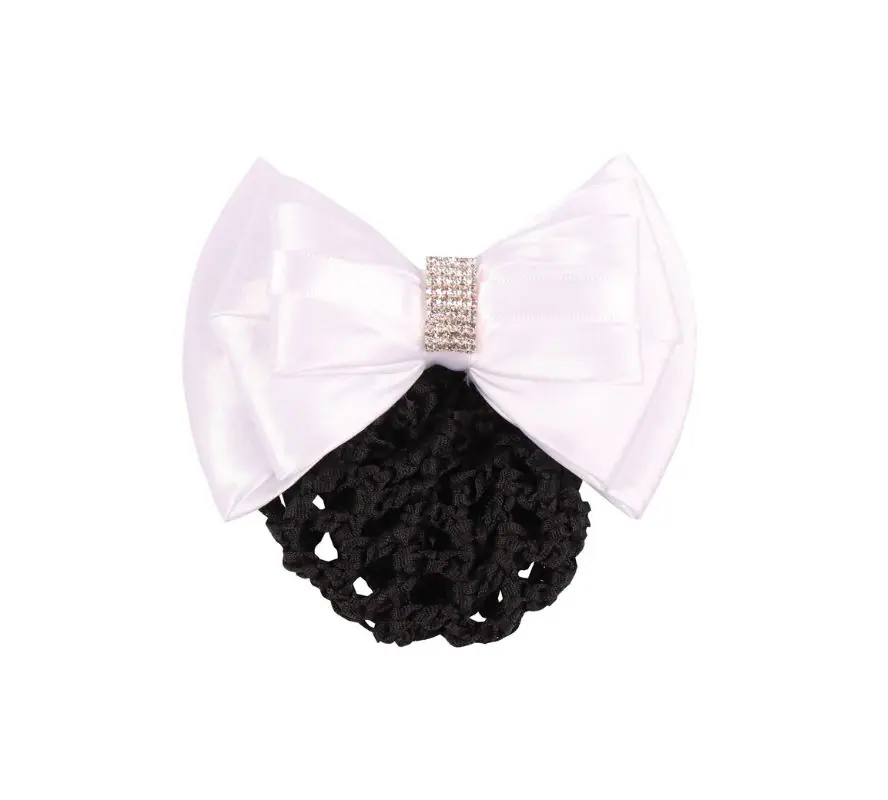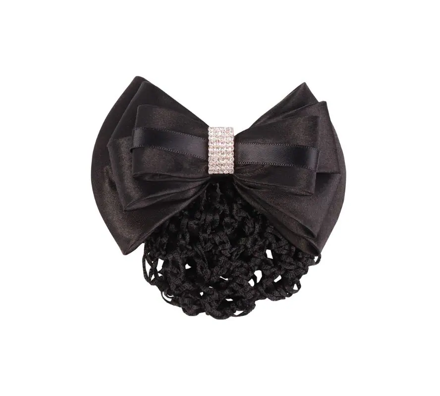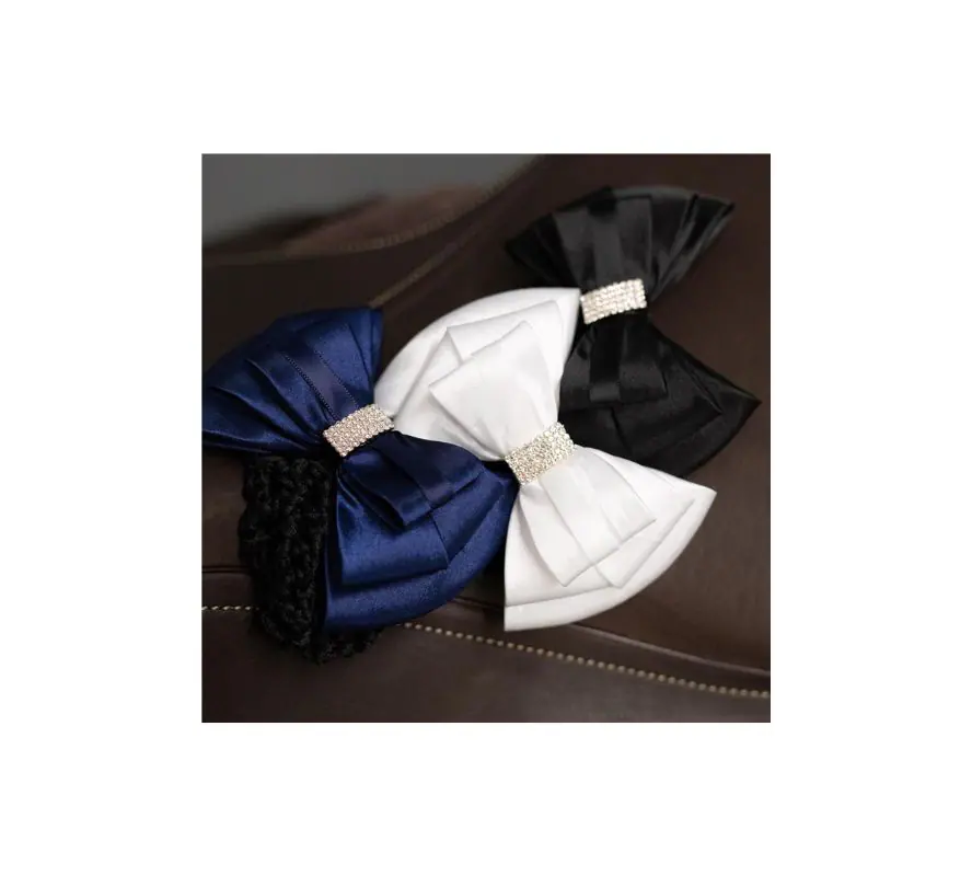 緞面的布料以蝴蝶結造型呈現,蝴蝶結中央以帶有玫瑰金光澤的水鑽排列成長方形,配有網袋、固定夾。