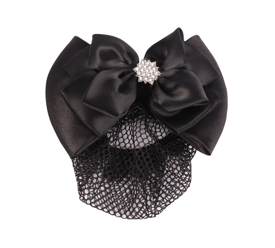 緞面的布料以蝴蝶結造型呈現,蝴蝶結中央以銀色光澤的水鑽排列星型形狀,配有網袋、固定夾。