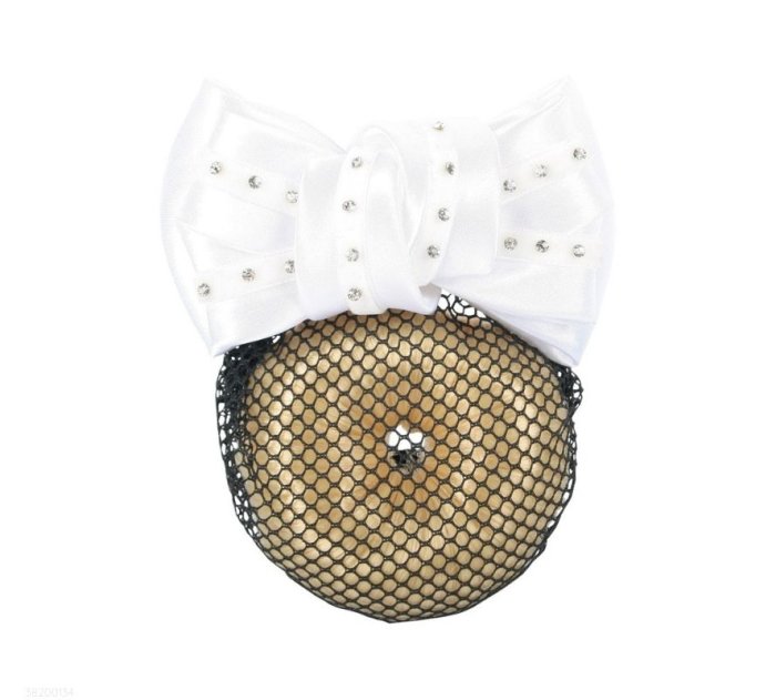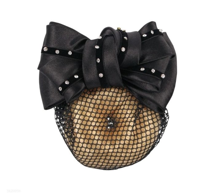 緞面的布料以蝴蝶結造型呈現,搭配銀色系水鑽,配有網袋、固定夾