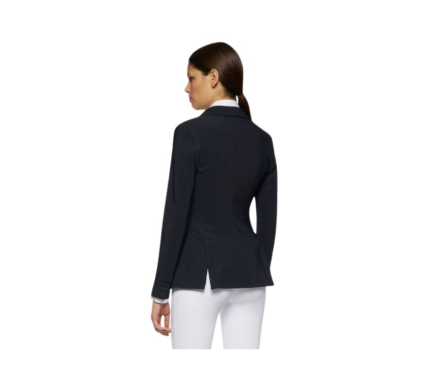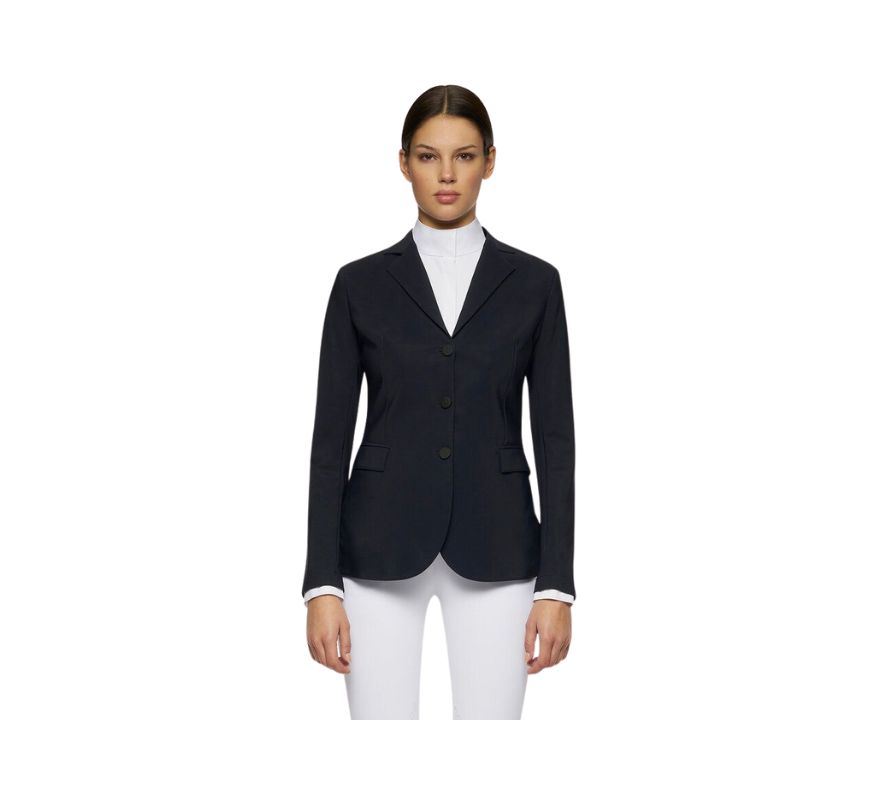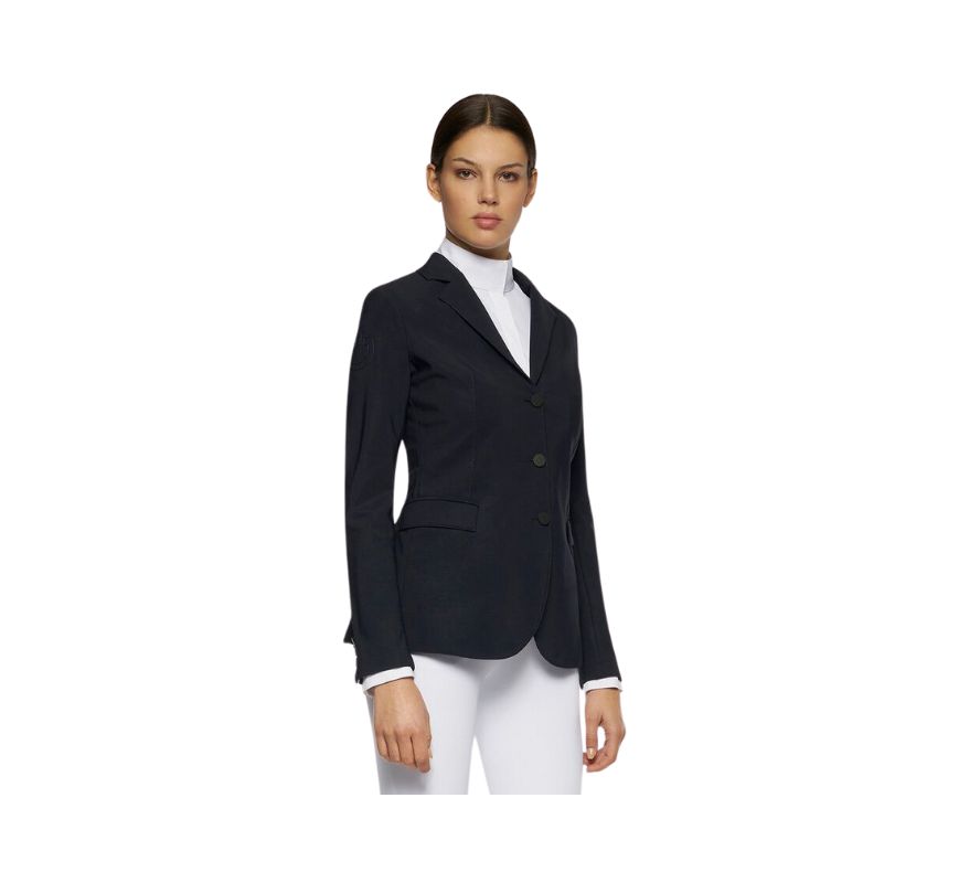 CT女款西裝外套-GGD033-黑色。展現功能性與優雅結合的品牌特色,融合馬術傳統與高性能材質,提供極致舒適感。這款外套採用特殊的雙向彈力技術面料製成,貼合身形、抗皺且隨動作靈活伸展,完美展現剪裁魅力。