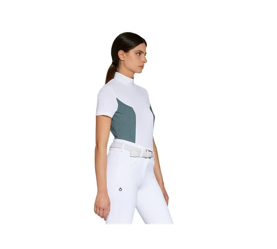 Cavalleria Toscana 女款白領比賽短袖上衣。腰部兩側湖水綠拼色的布料採用網眼面料,即使在台灣炎熱的氣候裡也能保持涼爽的理想選擇。白色面料為舒適親膚的萊卡材質,同樣保有了透氣、速乾的特性,保證騎手穿上後無與倫比的舒適度與靈活度。隱藏式的拉鍊,讓整件上衣看起來更乾淨俐落、有一致性。