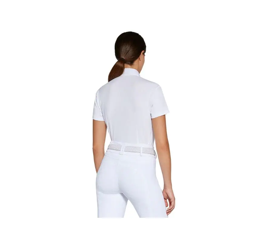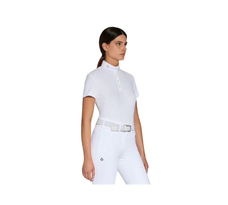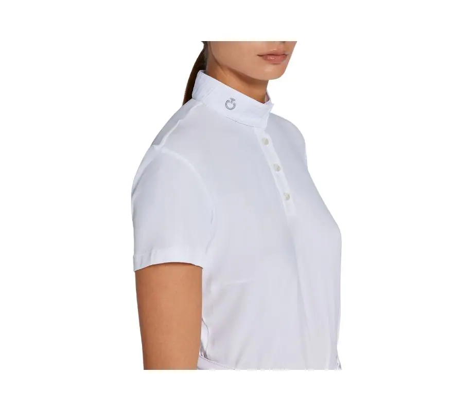 Cavalleria Toscana 女款白領比賽短袖上衣。整件上衣是素雅的白色,配上領口抓皺的小設計,使整件上衣帶有浪漫且優雅的視覺感,適合喜歡簡約又想要獨一無二的你。細密的珠地布面料,有著細且縝密的網孔,因此可以感覺得到風吹進衣服裡,非常合適台灣炎熱的夏天,此外珠地布面料還帶有柔軟的手感,因此穿上後會非常舒適、貼身。胸前採用三顆經典的排扣。