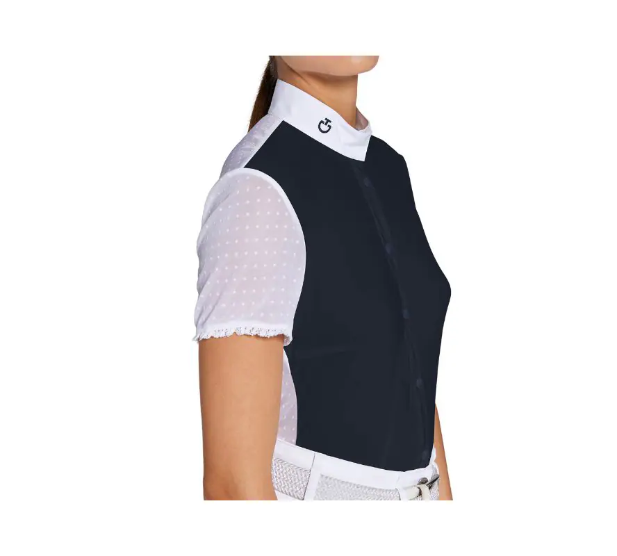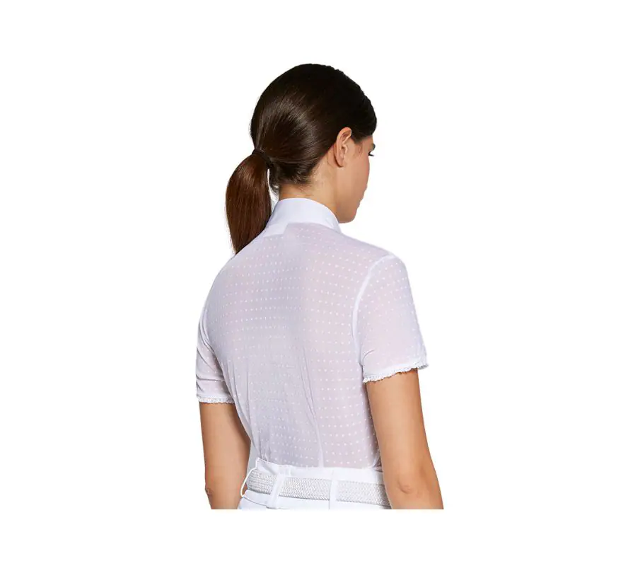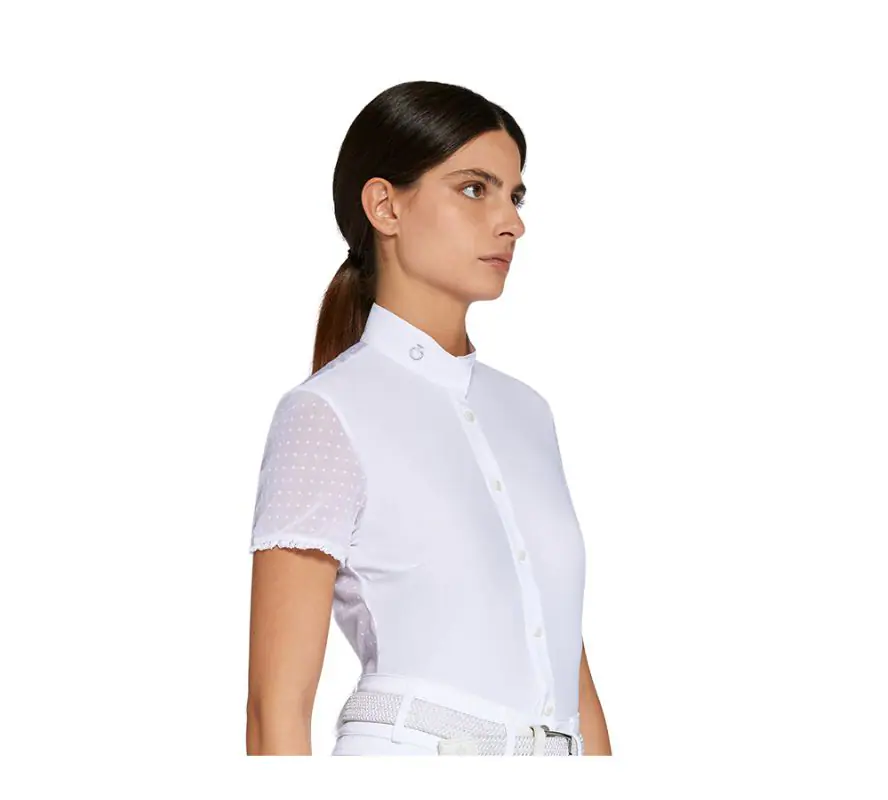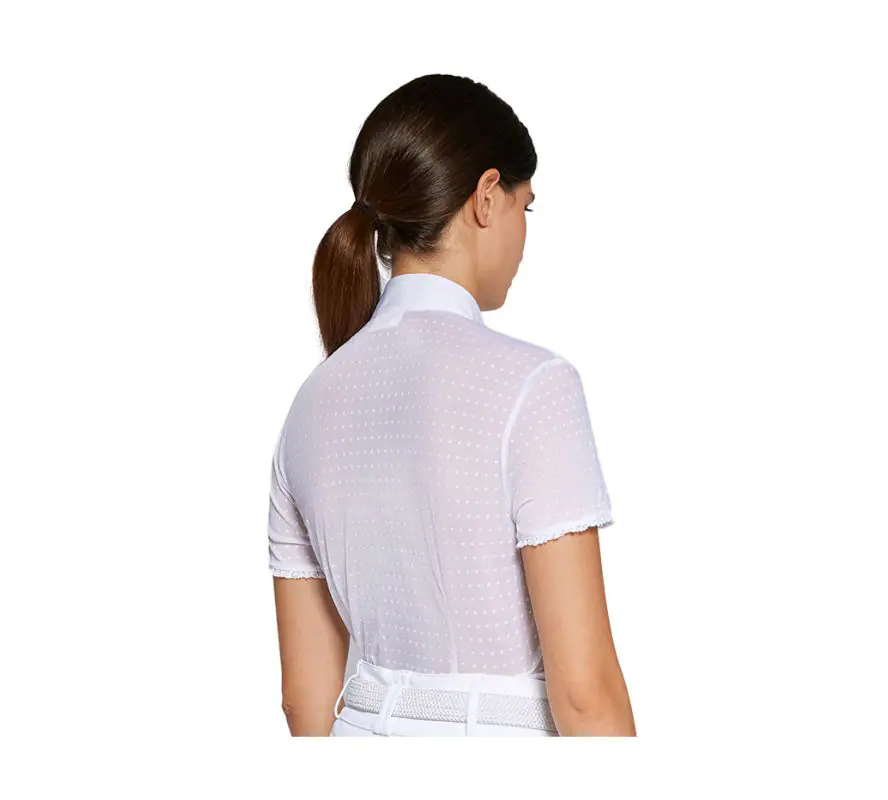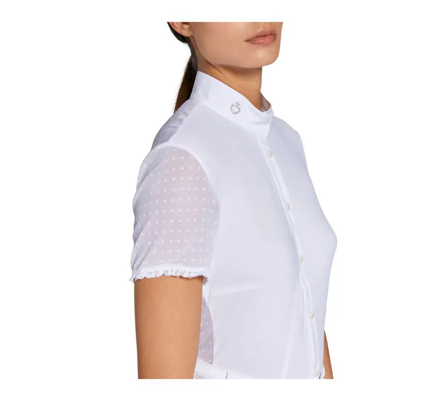 Cavalleria Toscana女款白領上衣-CAD257,是一款精心製作的白領上衣,採用最高品質的布料,特別為那些追求舒適與時尚完美結合的騎手量身打造。整件上衣非常優雅可愛,青春與活力感滿滿。正面採用純白的面料,後背拼接透膚的網紗,並於網紗上有波點的裝飾,袖口亦有蕾絲裝飾。