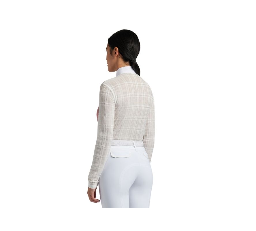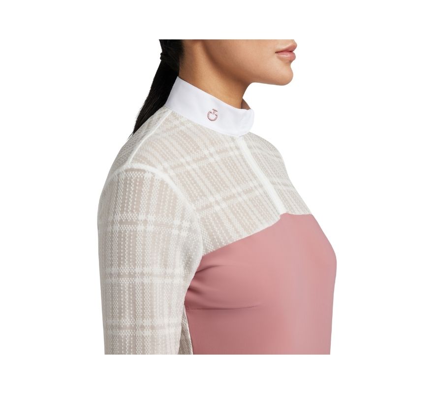 白色衣領和中央塗層拉鍊是獨特的細節,提升了襯衫的美感,衣領上有乾燥玫瑰粉色的Logo刺繡。袖子和背面採用帶有圖案的技術面料製成,既具有視覺吸引力,又增強了性能。結合實用性和優雅,體現品牌的創新。CT對品質和細節的堅定不移的奉獻精神,這款襯衫非常適合熱衷於騎行並努力展示其潛力和領導力的女性,是任何馬術衣櫃的必備單品。