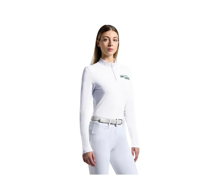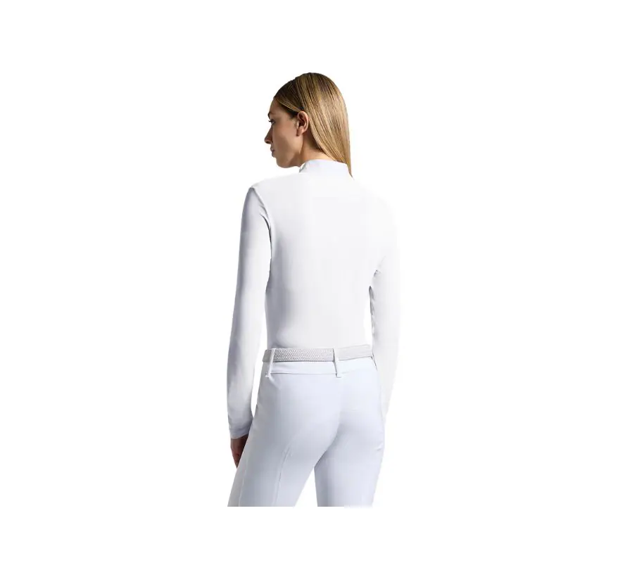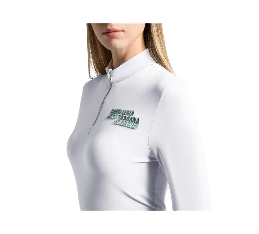 Cavalleria Toscana 女款長袖比賽襯衫專為比賽場合設計,兼具優雅與功能性。輕盈透氣技術布料確保最佳舒適度,即使在高壓環境下依然保持涼爽。精緻設計包括鎳製拉鍊與胸前刺繡標誌,增添獨特魅力。白色領口與細膩工藝提升正式感,是騎士參賽時的理想選擇。這款襯衫完美結合時尚與性能,為比賽增添專業氣質。
