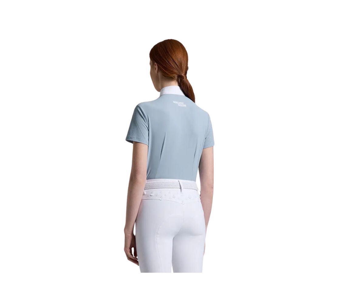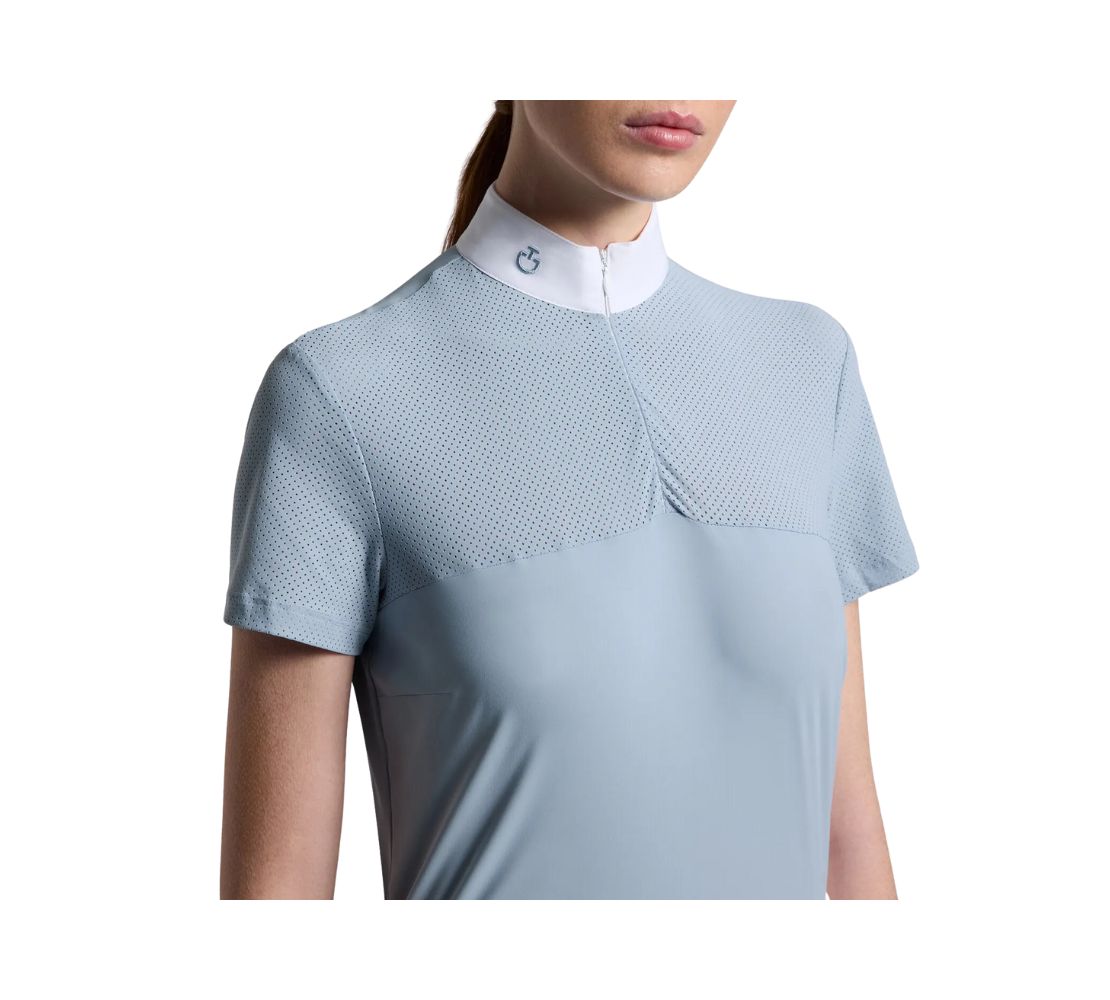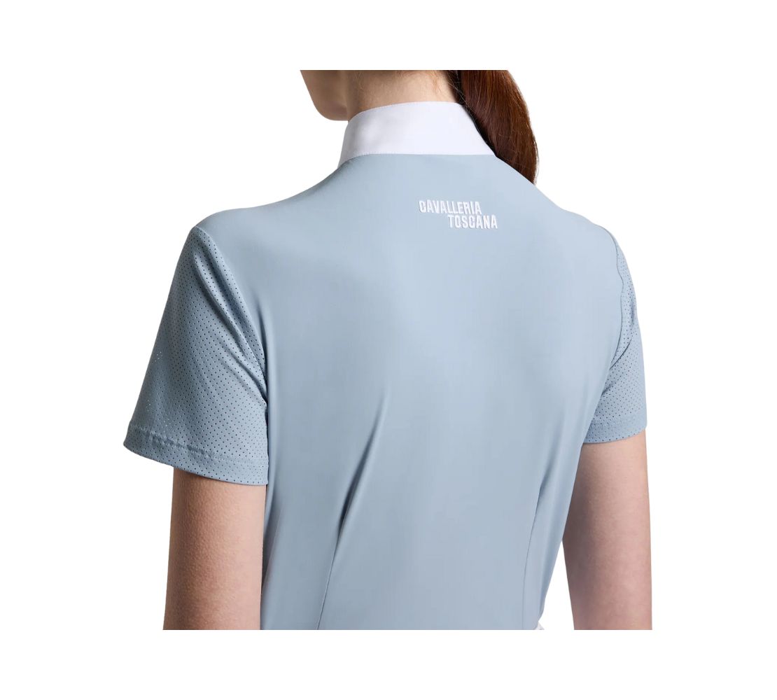 Cavalleria Toscana 女款短袖比賽襯衫,結合高機能性與無可挑剔的時尚感。輕量技術布料搭配透氣鏤空針織細節,確保騎乘時的極致舒適度。白色府綢領口與隱藏式拉鍊設計兼具優雅與便利性。背部與領口的熱壓刺繡標誌增添獨特風格。符合人體工學剪裁與高品質面料,使這款襯衫成為追求專業與時尚的騎士理想選擇。