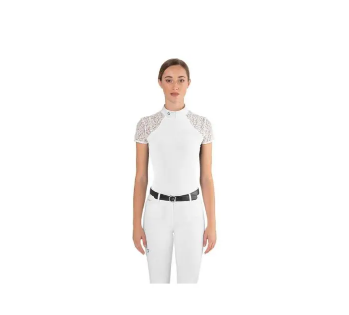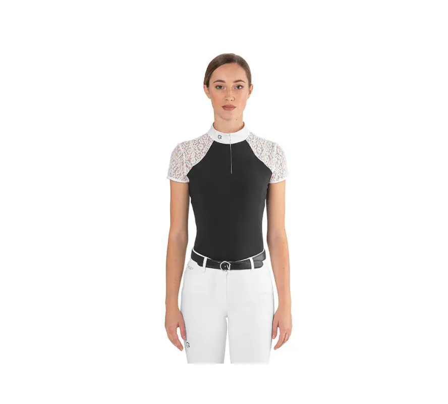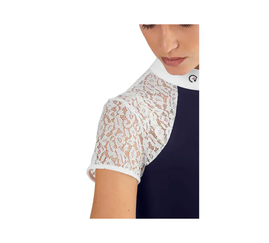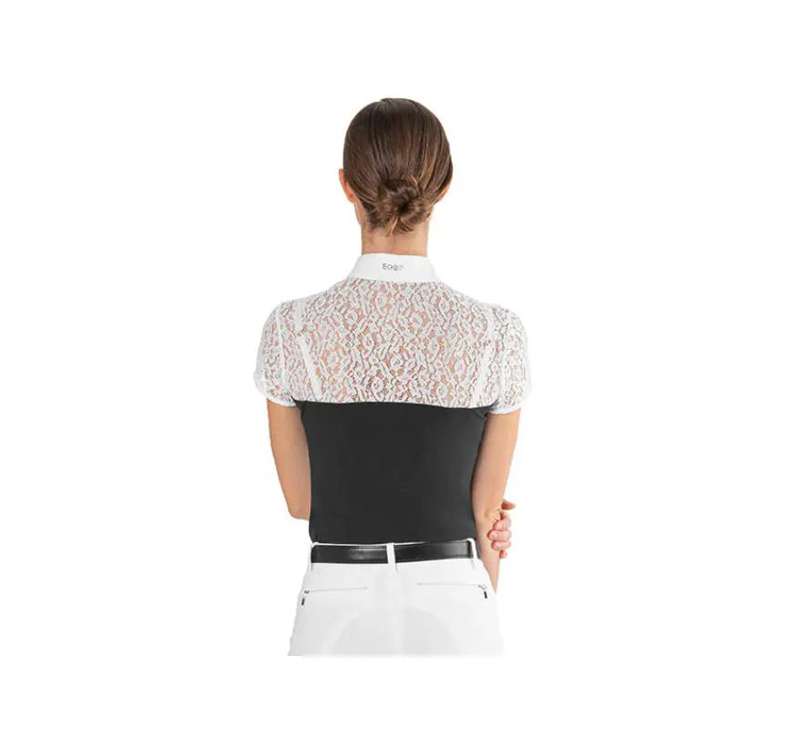 獨特的女性化掛脖設計搭配彈性白色蕾絲肩部與袖子,隱形拉鍊、立領設計及馬頭刺繡增添時尚感。有三種對比色選擇,展現迷人風格;提供短袖與長袖款。易於護理,可精緻機洗,並附有清晰的護理指引,確保長久美觀。