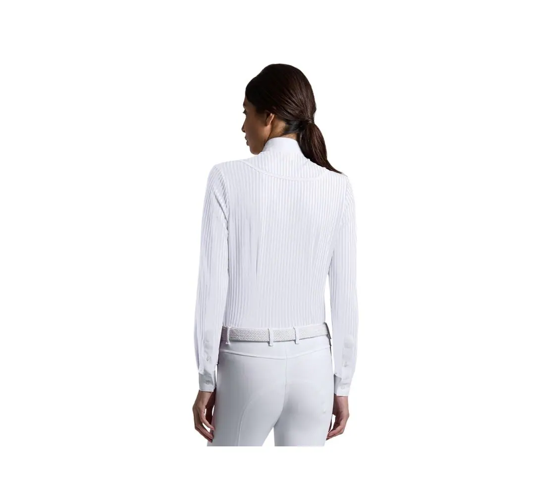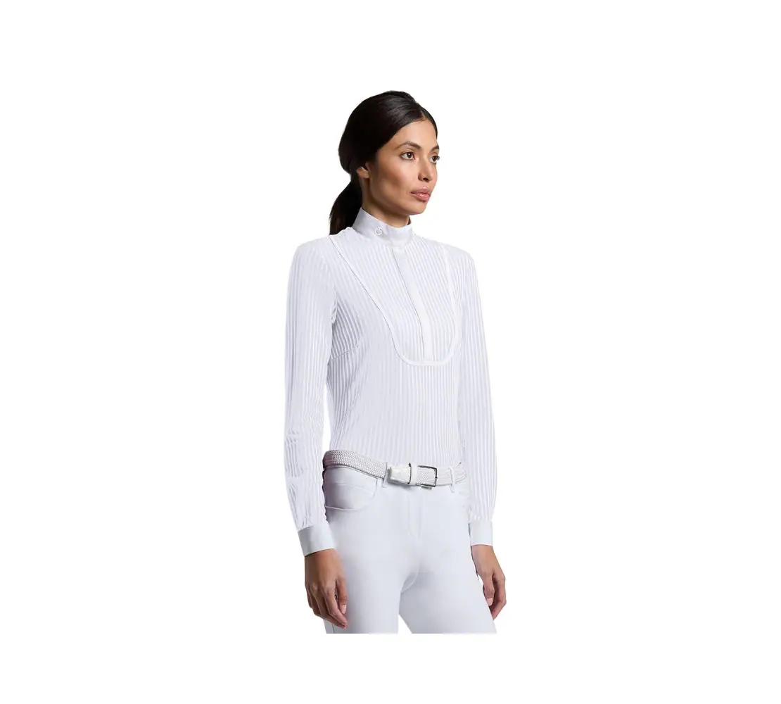 Cavalleria Toscana 女款白領上衣 – CAD280 – 白色 採用經典條紋設計與精緻府綢細節,展現義大利品牌的優雅格調與專業性能。長袖版型結合正式白領與隱藏式結構,營造簡潔俐落的競賽造型。