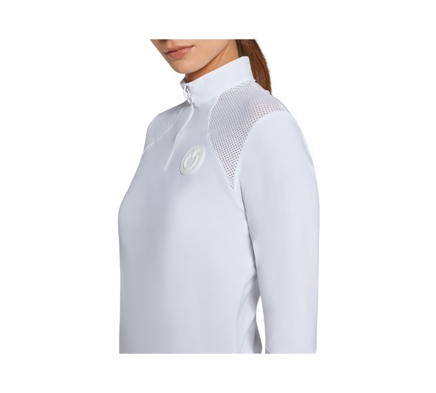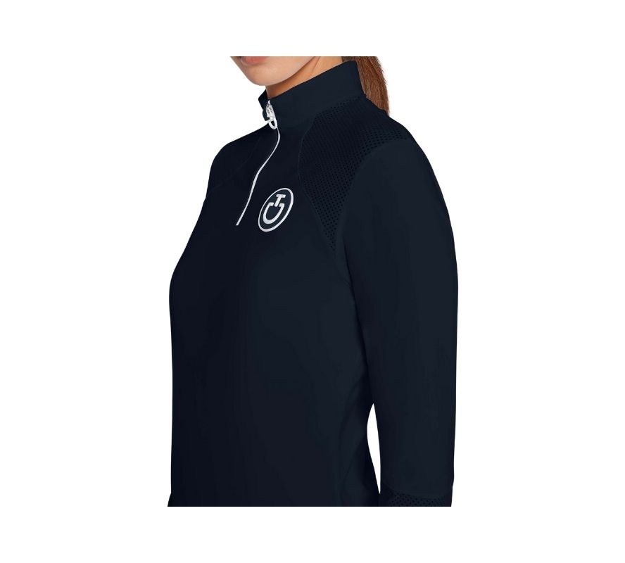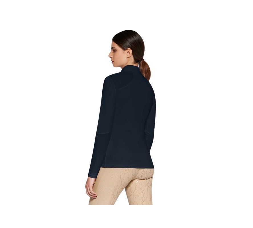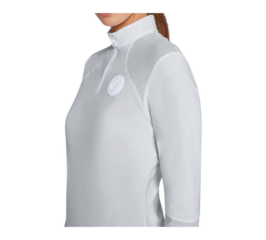 Cavalleria Toscana 女款休閒長袖上衣。是一款適合台灣夏季穿著的長袖上衣。網眼的面料分佈於肩膀以及小手臂的部位。其他部分為透氣性好、快乾的萊卡面料。在夏季裡穿著兼具了透氣涼爽以及防曬的功能。拉鍊設計,亦可正式、亦可休閒,隨意您搭配。