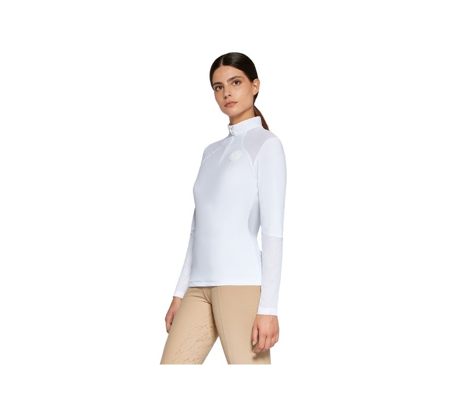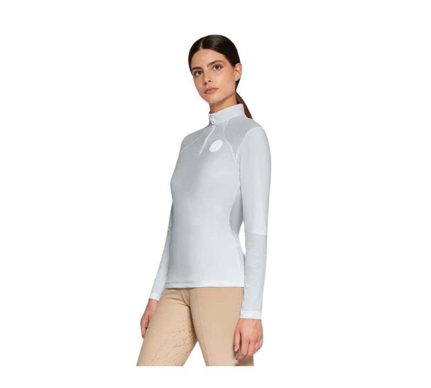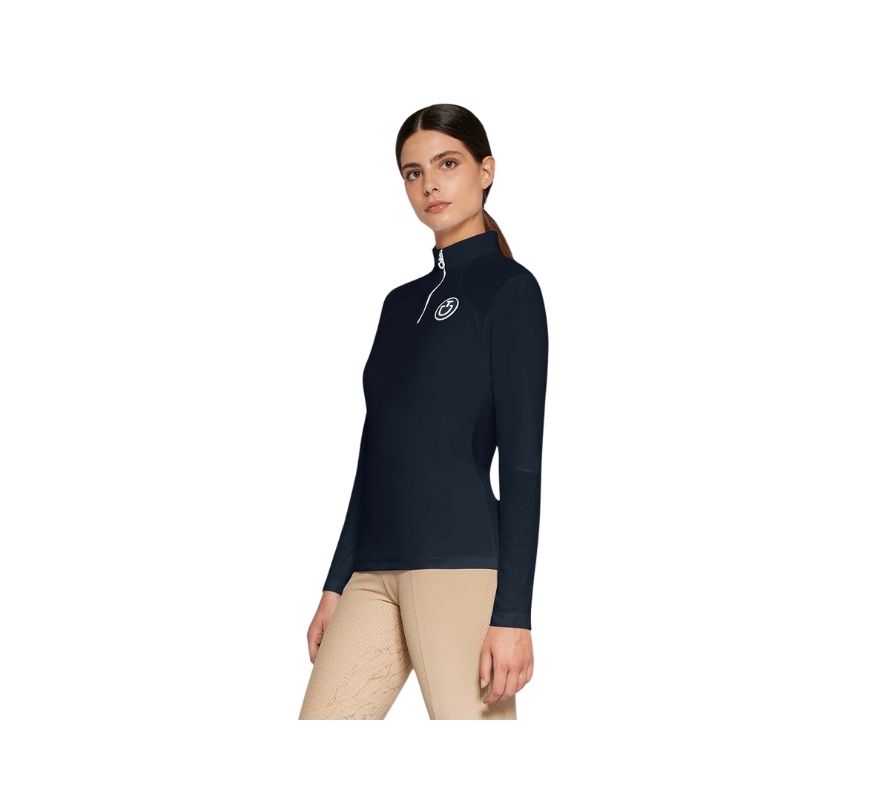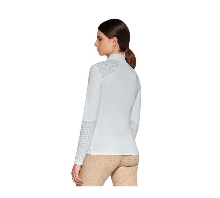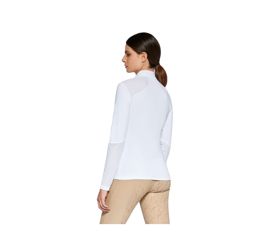Cavalleria Toscana 女款休閒長袖上衣。是一款適合台灣夏季穿著的長袖上衣。網眼的面料分佈於肩膀以及小手臂的部位。其他部分為透氣性好、快乾的萊卡面料。在夏季裡穿著兼具了透氣涼爽以及防曬的功能。拉鍊設計,亦可正式、亦可休閒,隨意您搭配。