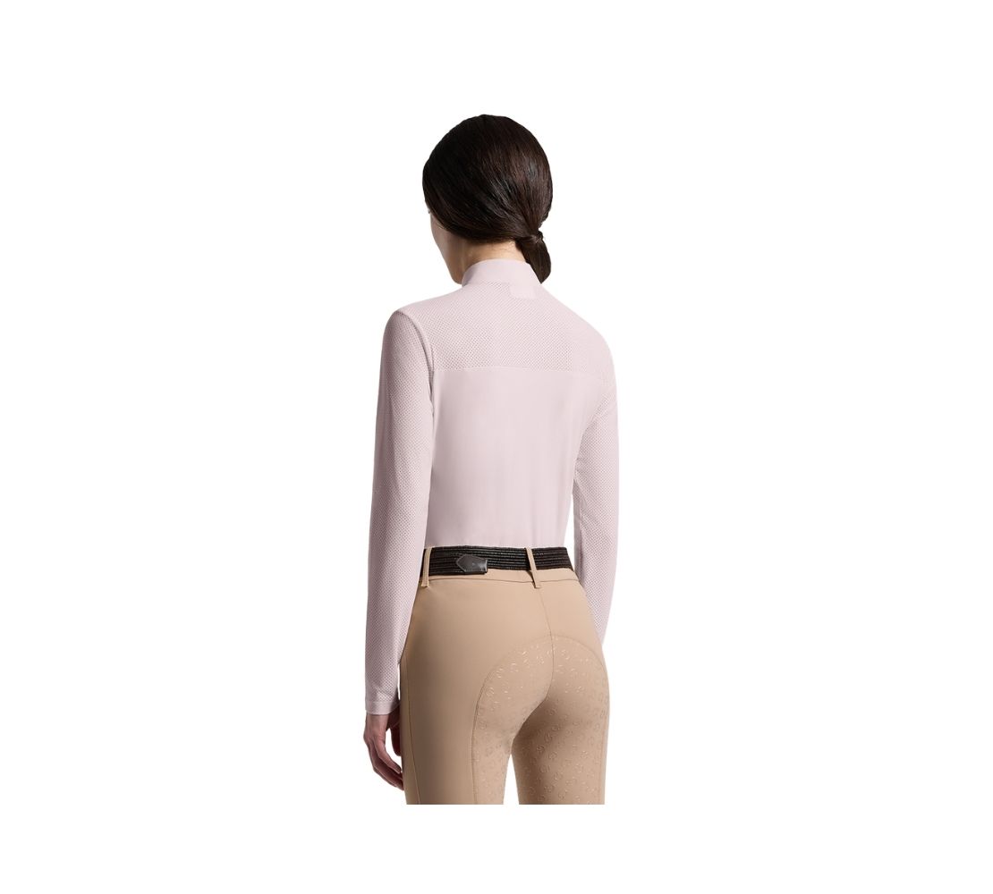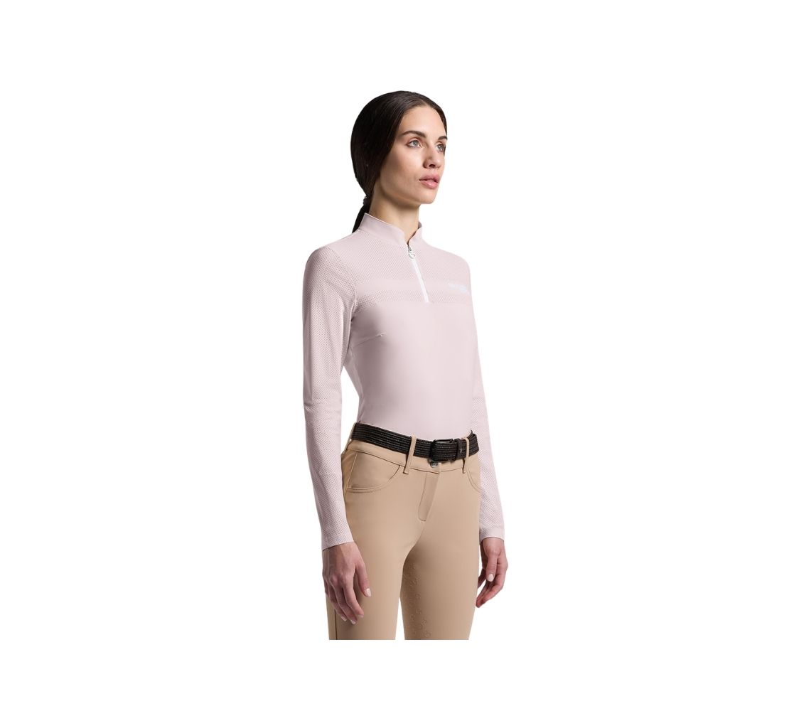 CT 女款休閒上衣-POD402 為訓練需求而設計,結合高機能與品牌經典質感。採用高品質 Eurojersey 機能布料,具備優異排汗與舒適度,並透過前後身與袖部的透氣打孔拼接,提供精準散熱效果,是馬場日常與訓練不可或缺的專業單品