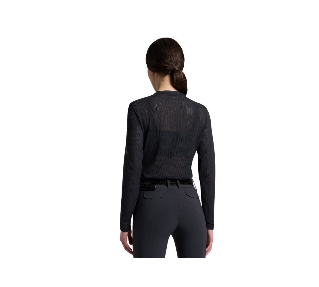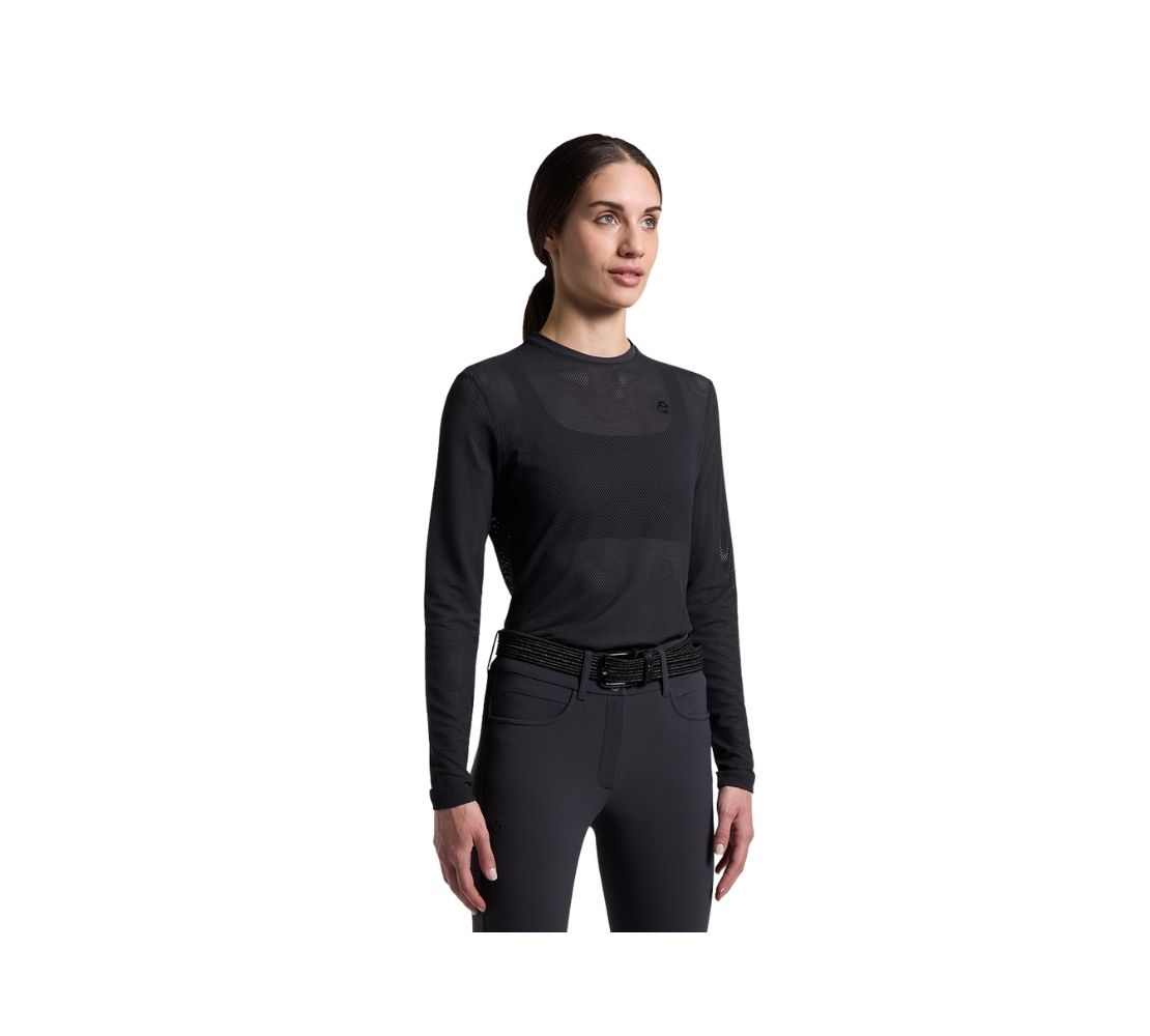 這款 Cavalleria Toscana 長袖 T-shirt 專為高強度騎乘設計。整件採用創新透氣打孔布料製成,帶來卓越通風效果與快速汗水蒸發機能,即使劇烈運動也能維持乾爽。人體工學剪裁搭配高彈性面料,在馬鞍上提供完整活動自由。簡潔圓領設計,胸前低調同色系 CT 標誌呈現品牌質感。可作為機能內層或單穿使用,是極簡風格與高機能兼具的理想選擇