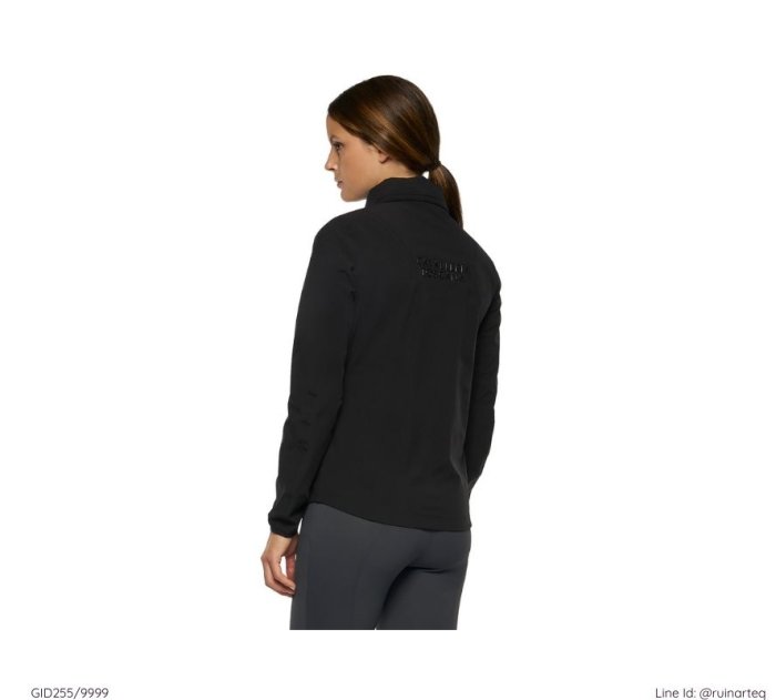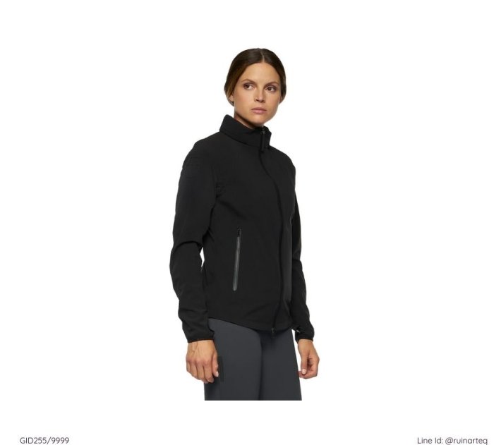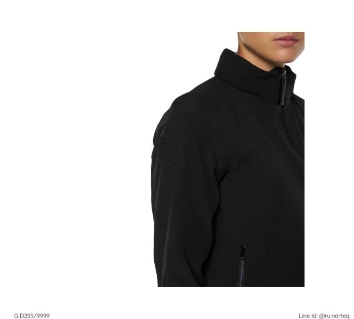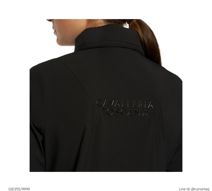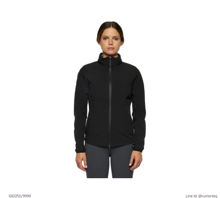 時尚的防風防潑水女款連帽外套,外套的帽子可收於領口的拉鍊內袋。袖口有固定帶,可將拇指穿過加以固定,使騎乘時固定袖管位置。後背以低調的矽膠材質印有Cavalleria Toscana字樣。