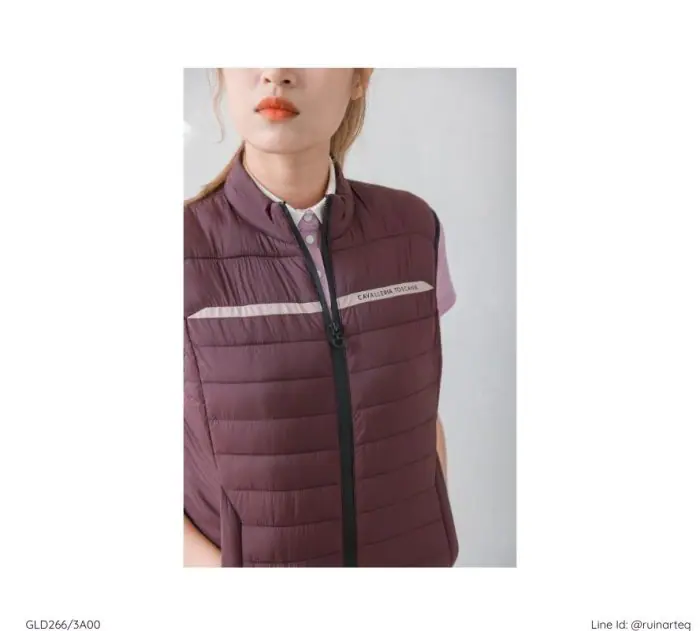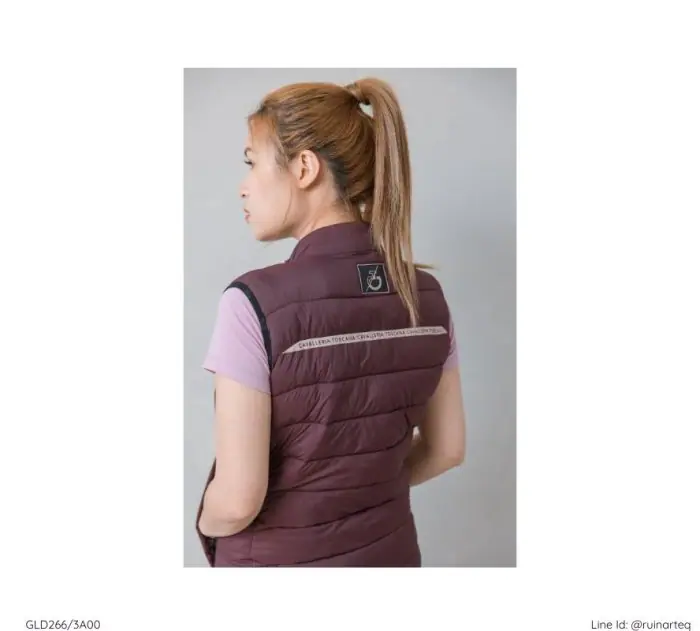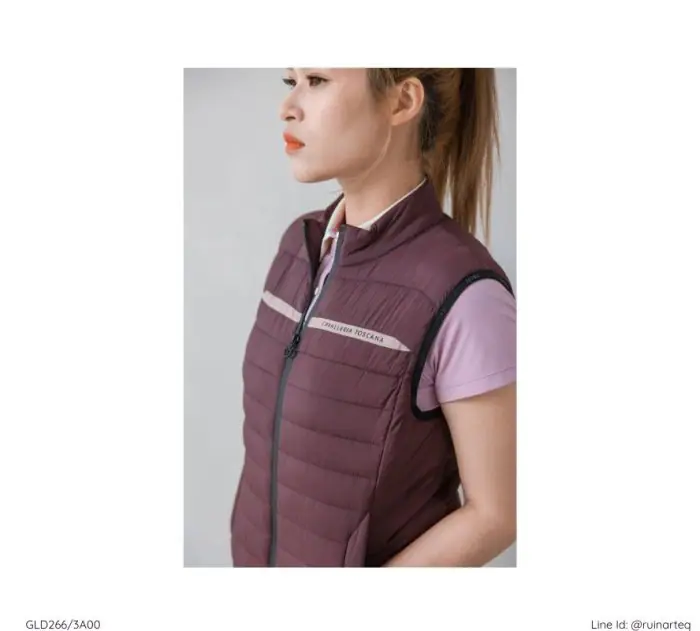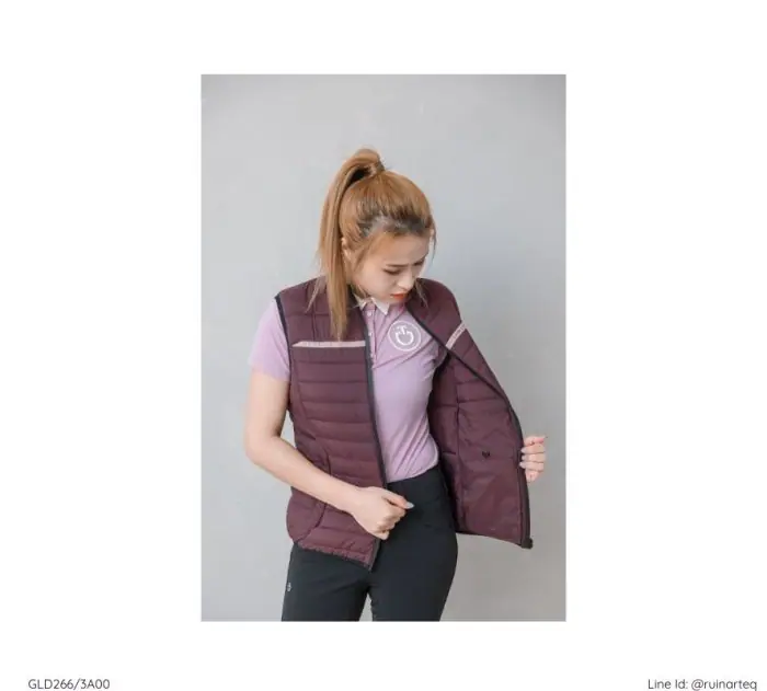 低領的保暖背心,適合初秋或是早春搭配穿著,專利的拉鍊設計,使背心整體更加防風已達到保暖效果,帶有紫色調的棕色為主體,非常適合搭配其他大地色系的上衣與馬褲。兩側的口袋是沒有拉鍊的。
