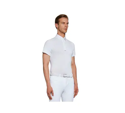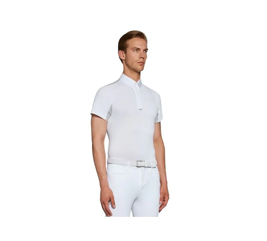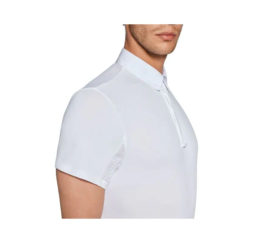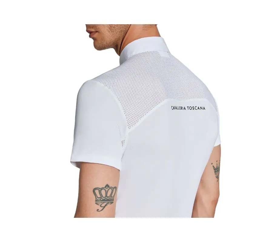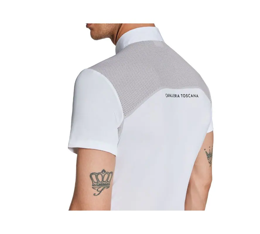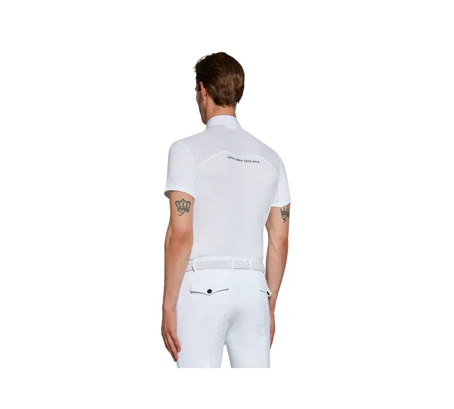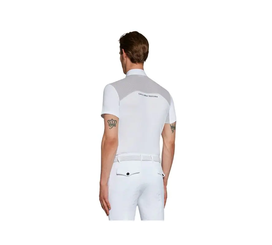 Cavalleria Toscana 男款短袖白領襯衫,符合正式比賽規定的馬術上衣。後背上側與腋下採用網眼面料,並拼接大面積的萊卡主面料,整件上衣非常透氣、速乾、舒適。簡約約的刺繡 Logo 位於領口右側,並使用同色縫線。另外後背上方也有 Cavalleria Toscana 刺繡。