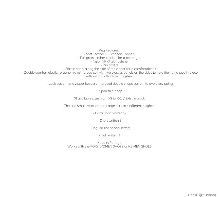 内部全粒面皮革 – 提供更好的握持感 尼龍YKK®拉鍊 拉鍊側邊設有彈性布料,提供舒適的貼合感 雙層舒適彈性:符合人體工學設計,兩側設有彈性布料,無需任何附著系統即可保持短靴與綁腿之間的穩定度 鎖定系統和拉鍊固定器:改進的雙按鈕系統,防止拉鍊意外打開 提供18種不同尺寸,從XS到XXL,並有黑色選擇 適用於FOXY WOMEN SHOES或K2 MEN SHOES 規格 XS(41-44/30.5-32.5) 商品評價 目前沒有評價。 只有註冊並且購買過商品的顧客才能撰寫評價。