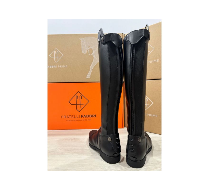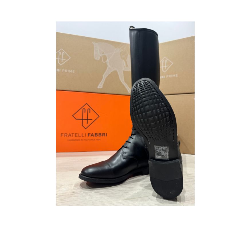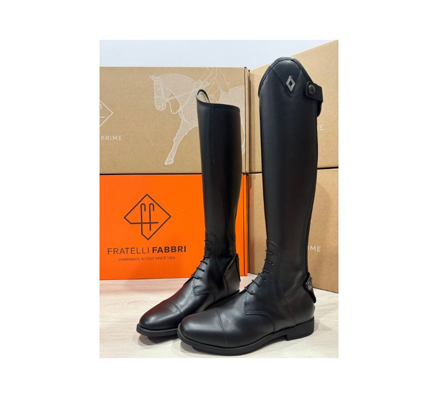 FABBRI 成人鞋帶長靴-Prim。重新定義了輕量化、耐用性以及對騎手需求的關注,提供了一款將創新與舒適感巧妙融合的全新設計。 靴子配備特別的系統,騎手可以根據喜好調整馬刺的高度,共有三個不同的高度選擇。 透氣的皮革內裡、小牛皮鞋面和100%超輕橡膠鞋底樹立了品質的新標準。 彈性舒適的鬆緊帶確保了移動時的最佳靈活性,而拉鍊則具有極高的強度和耐用性。