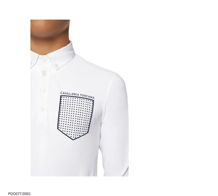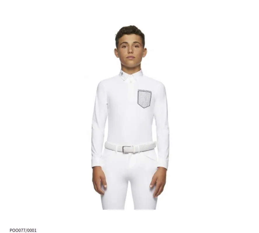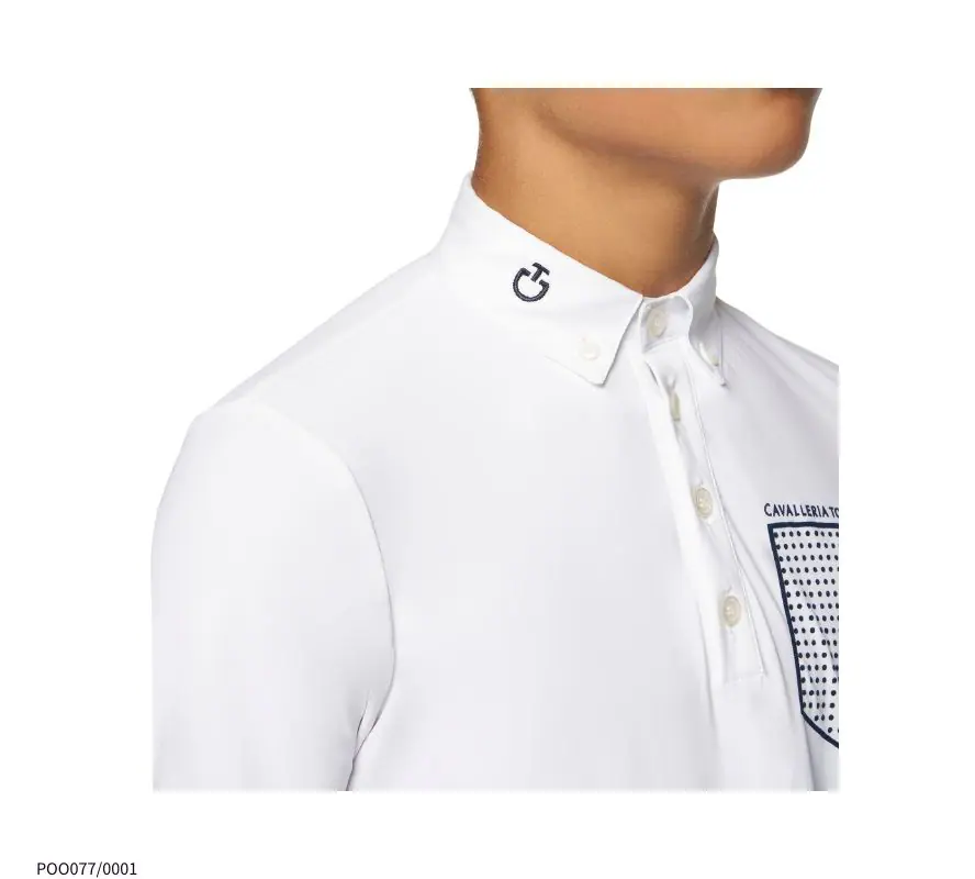 尺寸建議表 CT 男童長袖白領上衣,排釦設計,並配有白領,是可以於正式比賽中穿著的上衣,胸前繡有口袋的圖案。