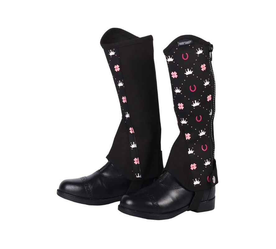 絨面合成皮革,配有可愛的印花裝飾,具有舒適、柔軟、透氣的特性,此款皮革較為柔軟,也非常適合初學者騎馬初期的穿著。尺寸選擇多,拉鍊旁的彈性布料,可變範圍更大,能適合不同的腿型尺寸。可於30度水溫下清洗,不可烘乾