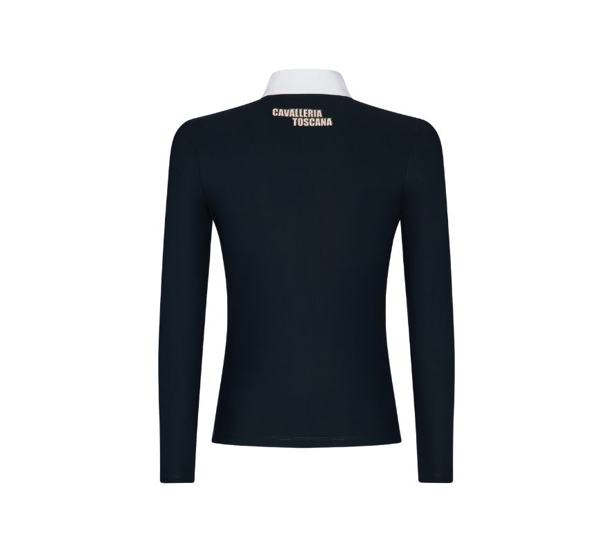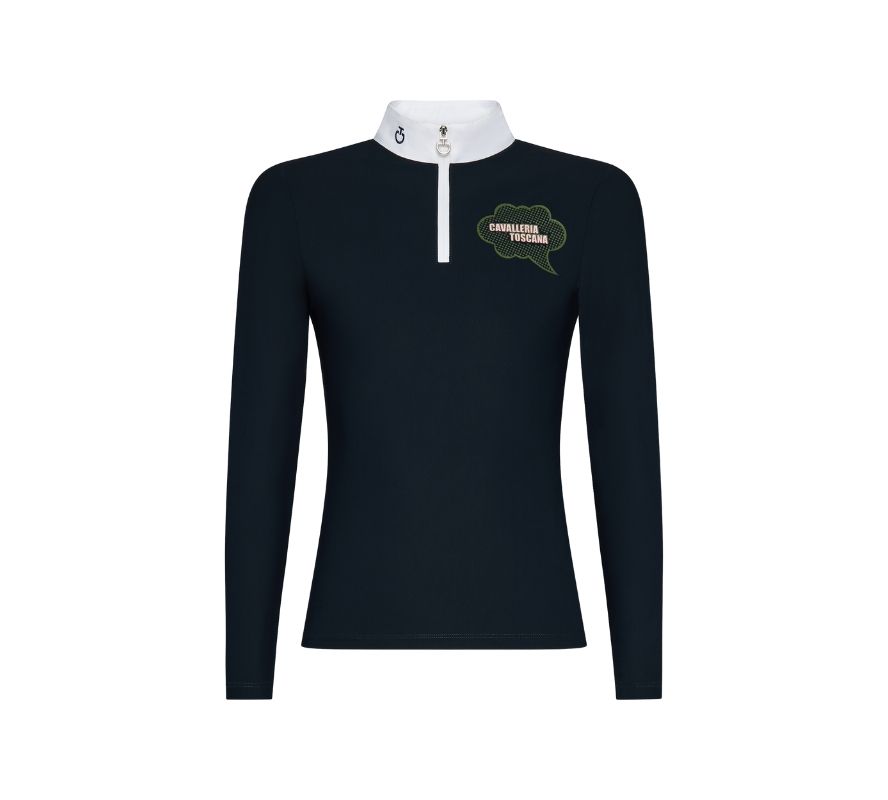 Cavalleria Toscana 女童白領長袖拉鍊、印花科技上衣。透氣、抗紫外線、快速乾燥,是這件上衣的特點。這款科技襯衫非常適合比賽,也可以作為日常休閒的穿搭。