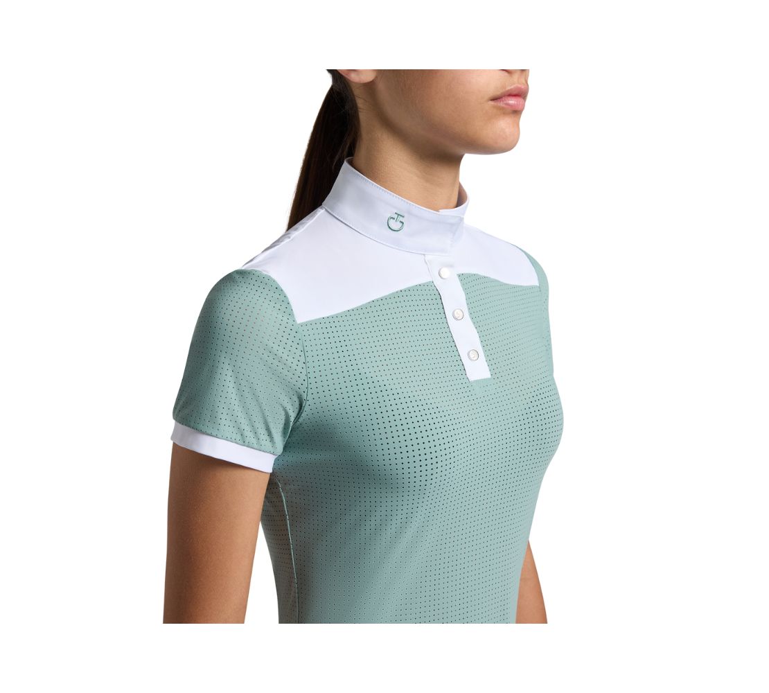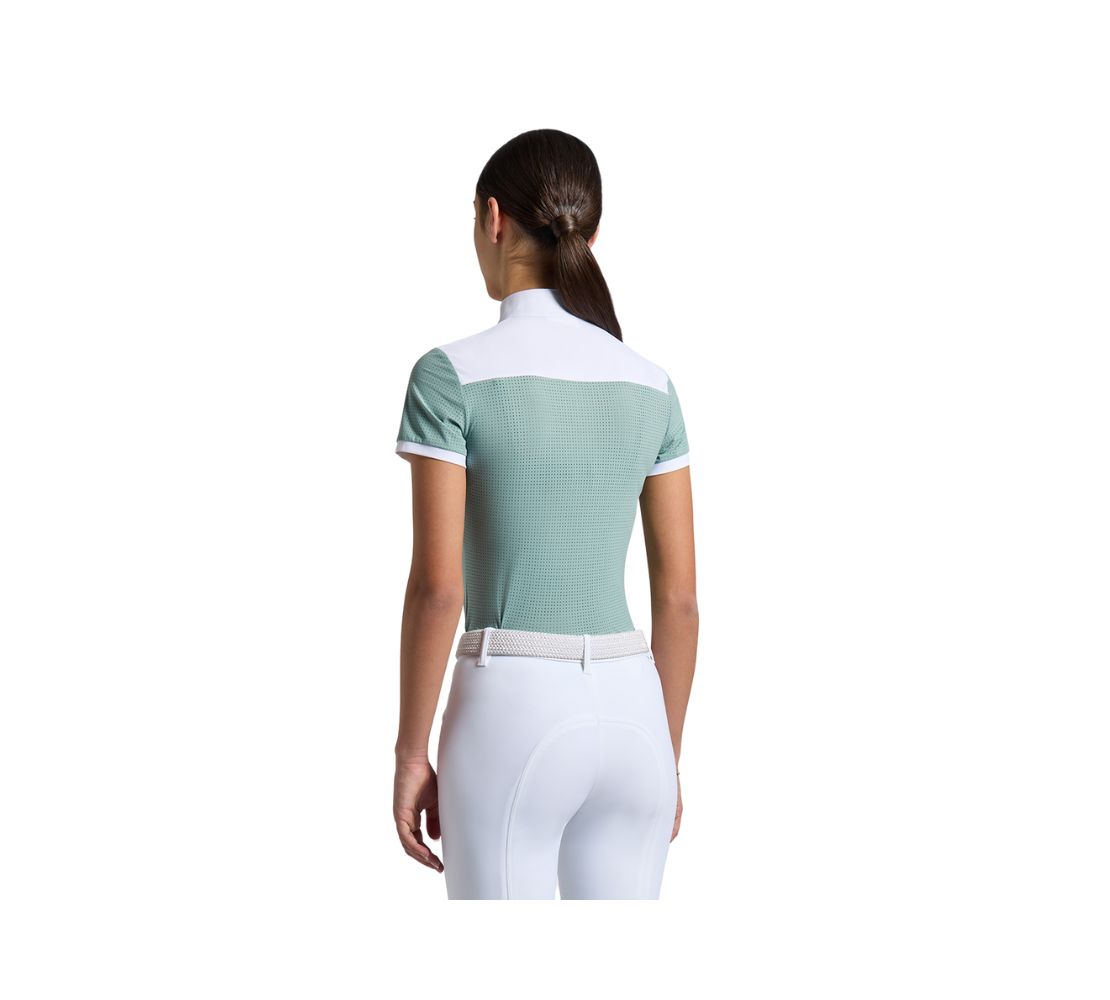 Cavalleria Toscana 女童短袖比賽襯衫結合機能與時尚,專為年輕騎手打造。輕盈透氣的鏤空針織布料確保比賽期間的極致舒適感。精緻的鏤空細節與隱藏式按扣領口,提供正式且時尚的外觀。領口上的 CT 刺繡標誌更增添獨特魅力。這款襯衫是比賽場合的理想選擇,完美融合性能與優雅風格。